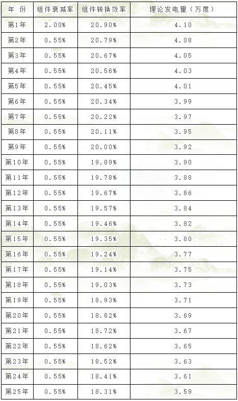 項(xiàng)目擬采用0.4kV電壓等級(jí)就近接入電網(wǎng),結(jié)合太陽(yáng)能資源情況,系統(tǒng)效率,組件衰減等因素,預(yù)估項(xiàng)目首年發(fā)電量約41000kWh,逐年發(fā)電量數(shù)據(jù)計(jì)算如下:
